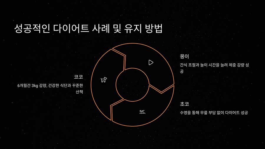 - 🐶 몽이: 간식 조절과 놀이 시간을 늘려 체중 감량 성공