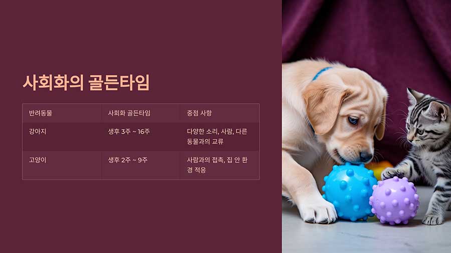 | 반려동물 | 사회화 골든타임 | 중점 사항 |
