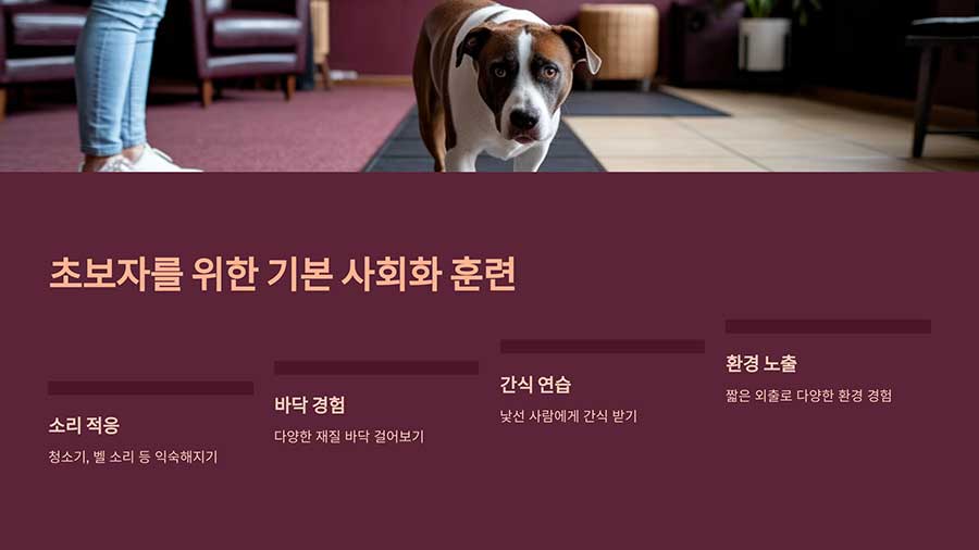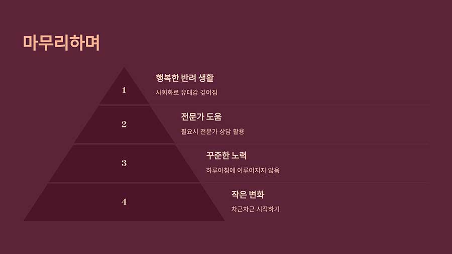 처음엔 어려울 수도 있지만, 작은 변화부터 차근차근 시작해 보세요. 그리고 훈련이 힘들거나 도움이 필요하다면 전문가의 상담을 받아보는 것도 좋은 방법입니다.