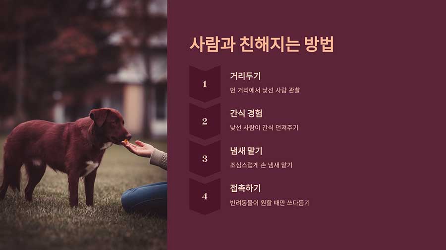 반려동물이 사람과 잘 어울리도록 하기 위해서는 긍정적인 경험을 많이 쌓아야 해요. 특히 낯선 사람을 만날 때 불안해하는 반려동물이라면 천천히 접근하는 것이 중요합니다.