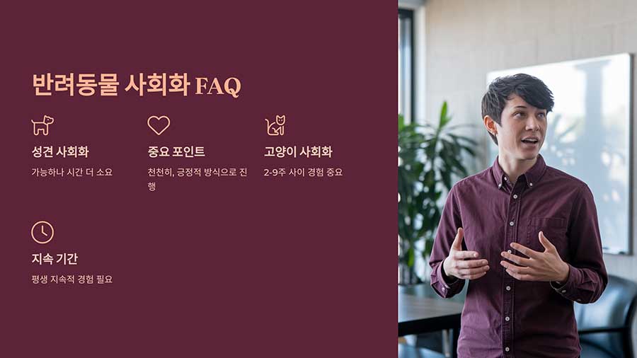 반려동물의 사회화는 하루아침에 이루어지는 것이 아닙니다. 보호자의 인내심과 꾸준한 노력이 필요하지만, 그 과정에서 반려동물과의 유대감이 깊어지고 행복한 반려 생활이 가능해집니다.