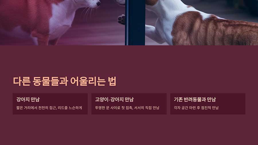다른 동물과의 만남도 사회화에서 중요한 요소예요. 하지만 성격이 다르거나 기존 반려동물이 있는 경우 조심스럽게 접근해야 합니다. 아래 표에서 상황별 접근 방법을 확인하세요.