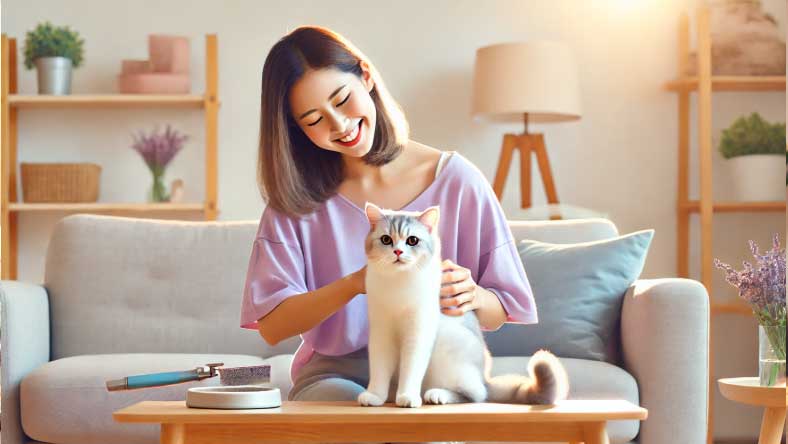 환절기에는 털갈이가 있지만 평소에는 매우 적어요. 하루 한 번 브러싱이면 충분하죠.