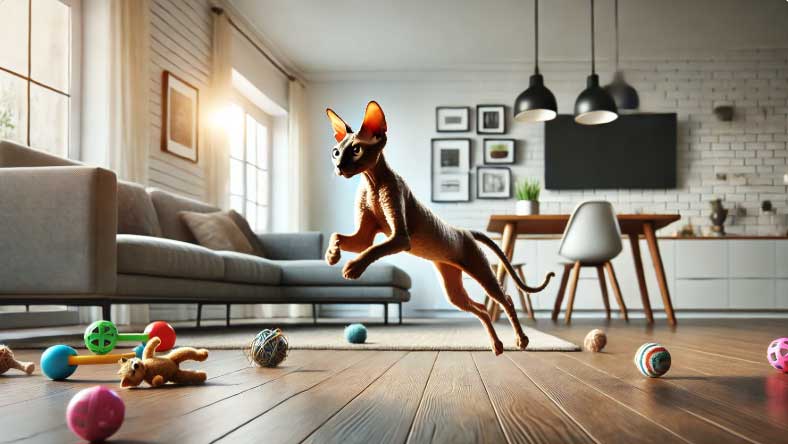 코니시 렉스는 하루 종일 에너지가 넘쳐요. 아침엔 창밖을 바라보며 새를 쫓고, 낮엔 장난감과 씨름하고, 밤에도 기운이 넘쳐 쇼파를 질주하곤 해요. 에너지를 발산할 수 있는 환경이 꼭 필요하답니다. 집사가 꾸준히 놀아주지 않으면 가구를 물어뜯거나 커튼을 타고 오르는 '사고뭉치' 모드가 될 수도 있어요.