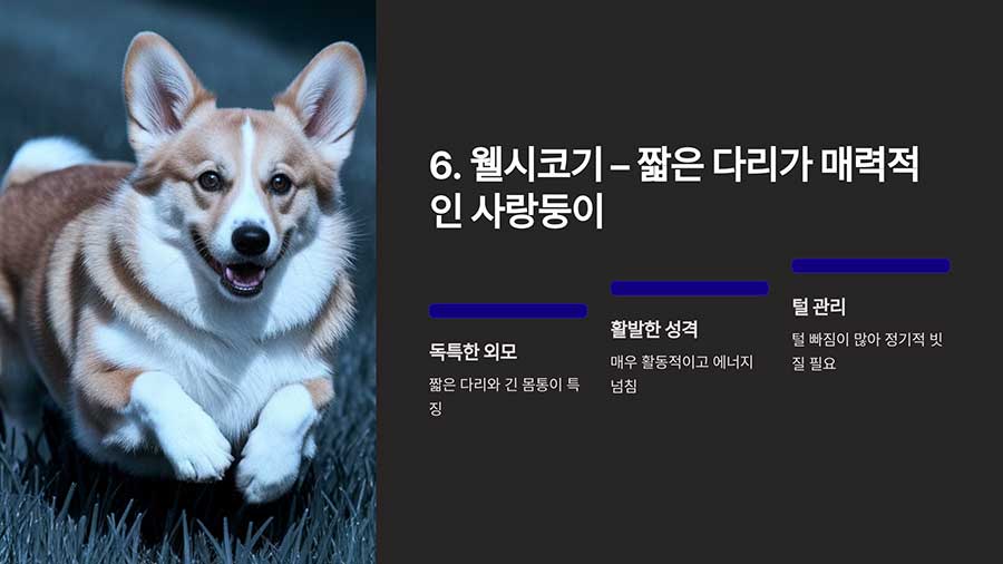 짧은 다리와 긴 몸통이 특징적인 웰시코기는 애교 많고 활발한 성격으로 많은 사랑을 받고 있습니다. 주인과 교감하는 것을 좋아하며, 지능이 높아 훈련이 쉽습니다. 다만, 운동량이 많아 충분한 활동 시간이 필요합니다.